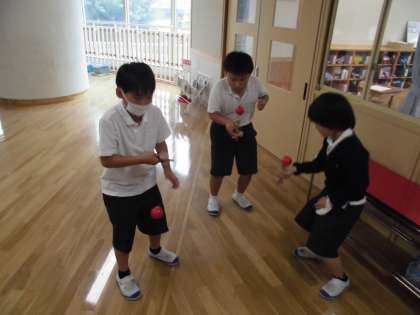 休み時間にけん玉で遊んでいる児童が何人かいます。