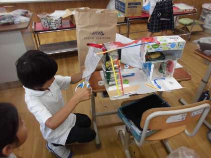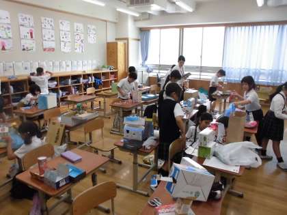 図画工作科の学習です。小石やペットボトルのふたなどを「小さなともだち」に見立て、その小さなともだちが喜ぶような家を作っています。空き箱やカップなど身の回りにある材料を使って、いろいろ工夫しながら作っています。