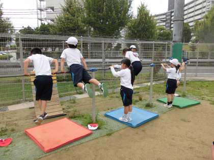 今日の体育はてつぼうあそび。前回りや逆上がりの練習をしています。他にもコウモリのようにぶら下がる技など、楽しくいろいろな技に挑戦しています。