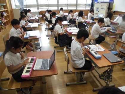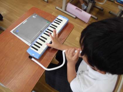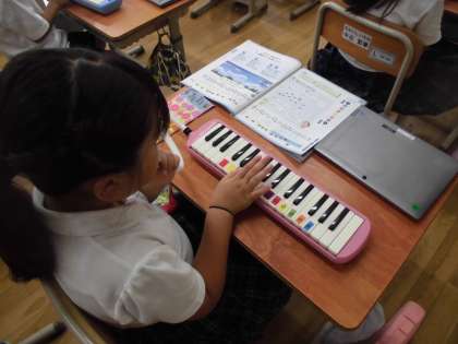 3年生のリコーダーが聞こえる隣から、2年生の鍵盤ハーモニカの音色が聞こえてきました。「ぷっかりくじら」のメロディに合わせて、伴奏を弾いていました。リズムもばっちりそろっています。聞いていて笑顔になりました。