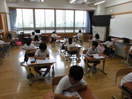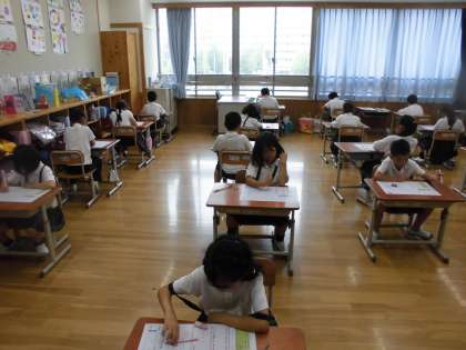 同じ時間に2組では算数のテスト、3組では国語のテストをしていました。どちらのクラスもみんな集中しています。普段の授業と少し空気が違います。