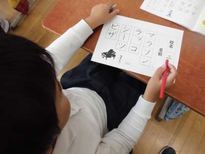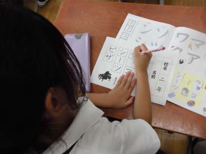 硬筆の作品作りに向けて練習です。出てくる文字は全てカタカナ。「ツ」と「シ」、「ソ」と「ン」、似ているけれど違います。気を付けることをみんなで確認してから練習をしました。きちんとかき分けられたかな?