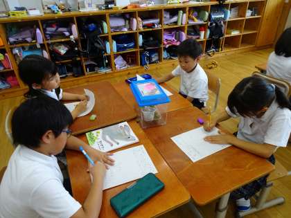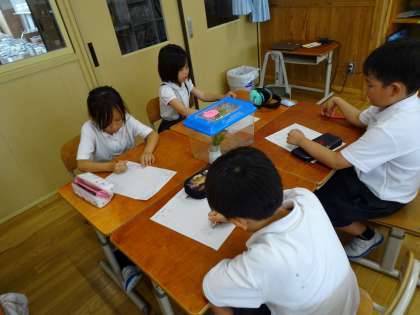 生活科の学習では、昨日捕まえた小さな友だちについて