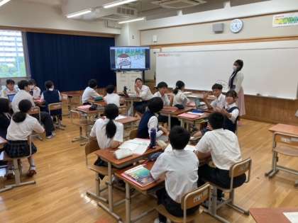 ALTのイターナ先生と最後の授業です。イターナ先生とのクイズも真剣に答えていた8年3組のみなさん。