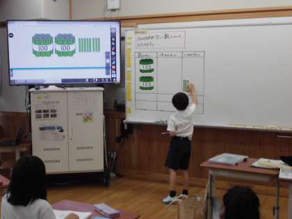 「100をこえる数」の学習をしています。今日は10の束がない数について考えました。出された問題は100を2こ、1を8こあわせた数。「10の束のところは0?」表に書き込みながら考えて、友達と考えを交流しました。