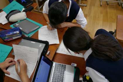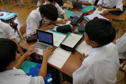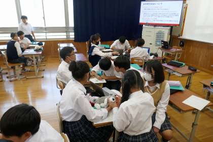 防災学習が進んでいる中で、それぞれのグループがどんな内容のスライドを作成しているかを交流する時間をとりました。他のグループの進行状況を聞くことで、工夫すべき点や改善すべき点を整理できたと思います。防災リーダーとして地域にどう貢献していくかの答えをみんなで協力して考え探していきましょう!