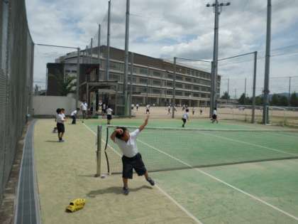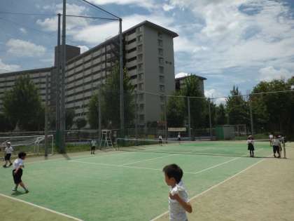 テニスコートでキャッチボールをしている様子です。