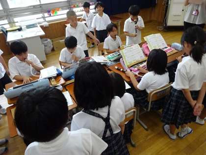 グループに分かれてそれぞれ担当する楽器を決めて演奏しています。写真はグループの演奏を聴き合って、演奏のよいところを見つける活動の様子です。自然と拍手があがったり「うまー!」と称賛する声が上がったり、楽しみながら学習していました。