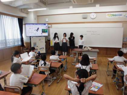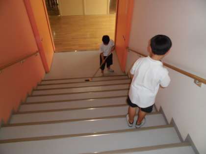 掃除終了時にはふり返りと6年生へのお礼を伝えます。上級生との楽しいひとときです。