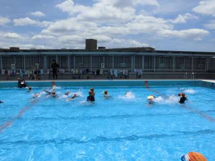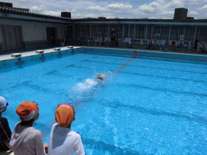 友だちとバディを組んで一緒に泳ぎの練習をしている様子が見られました。