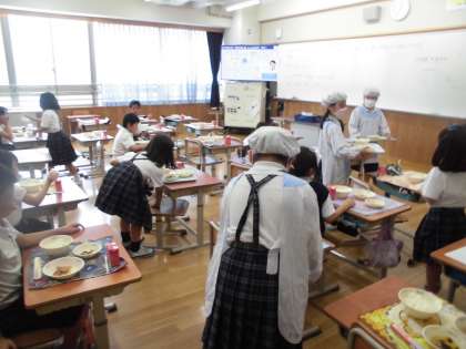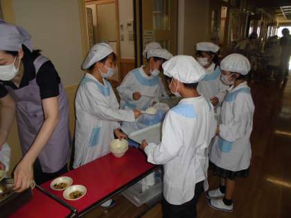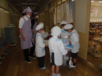 2年生になると、給食当番の仕事も手際よくこなします。よそい方も運び方もうまいものです。1学期の給食はあと2回。給食当番のみなさん、よろしくお願いします。みんな、しっかり食べますよ。