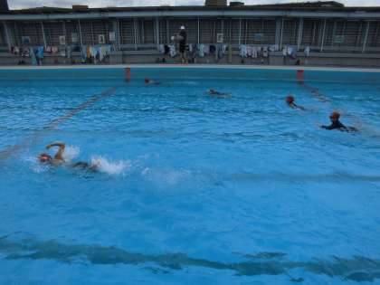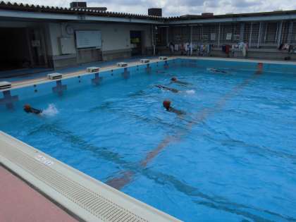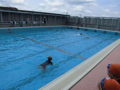 水泳検定、友だちの様子を見て応援している姿が見られました。
