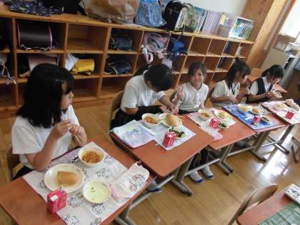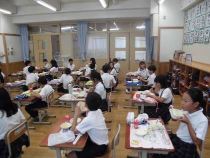 給食時間は友だちと楽しくお話ししながら美味しく食べています。