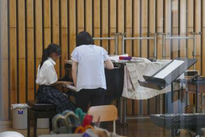 音楽室では、指揮者や伴奏者のための講習会が行われています。決められた日に登校し、音楽の先生にアドバイスをもらいながら練習に励んでいました。その姿を応援しようと、助っ人も何名か来てくれていました。休み明けには、みんなの合唱をしっかりとリードできるようによろしくお願いします。