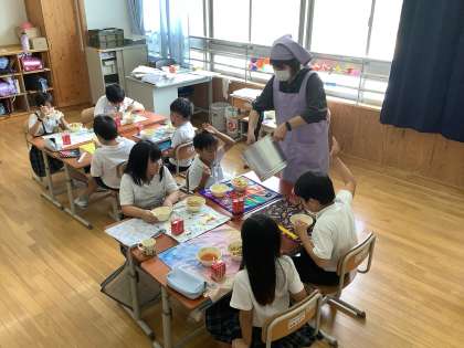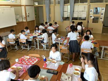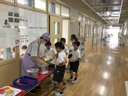 今日の給食は台風献立に変更になり、「チキンカレー」から「カレーピラフ」の変更でした。カレー食べたかったなぁ…。と少し寂しそうな言葉もありましたが、食べれば「美味しい!!」「おかわり!!」とハイテンションでみんなで楽しく食べることができました。