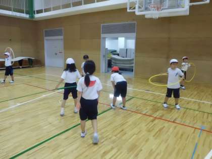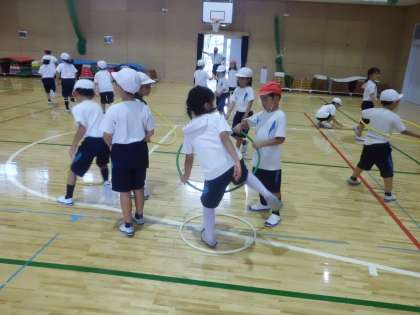 リーダーの動きをまねっこする活動に楽しんで取り組んでいます。