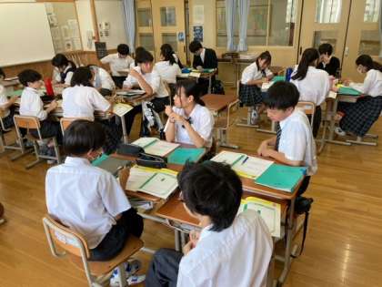 今日の蓮花タイムは、チャレンジ体験に向けての取り組みです。自分の長所や好きなことを改めて文章で書いていきます。やってみると、意外に難しい!