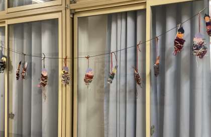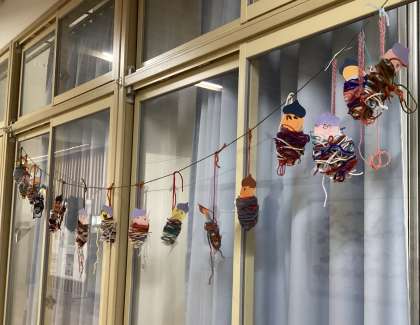 きょうはぐるぐる巻きつけたり、結んだりして「みのむし」を作りました。