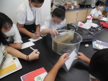 実際に川の流れのように水を流して、土が堆積する様子を観察しました。