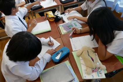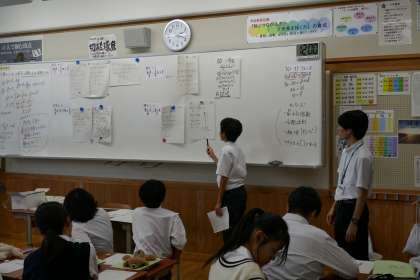 研修教員の福本先生による修了授業がありました。今までの学習で身につけた方程式の解き方を説明する時間を作る中で、各グループの代表者が積極的に発表してくれました。これからもたくさん解いてたくさん力をつけていきましょう。