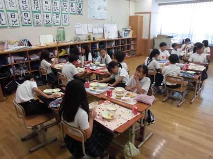 班の友だちと食べる給食は美味しいですね。