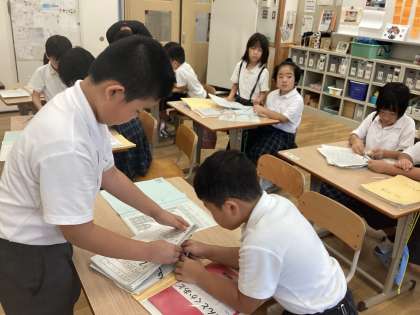 「ひもひもランド」で学習した紐の結び方で、プリントを束ねる作業をしました。