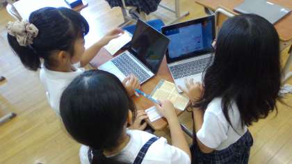 GIGA端末を使って苦手な学習を友だちと相談しながら取り組む姿、