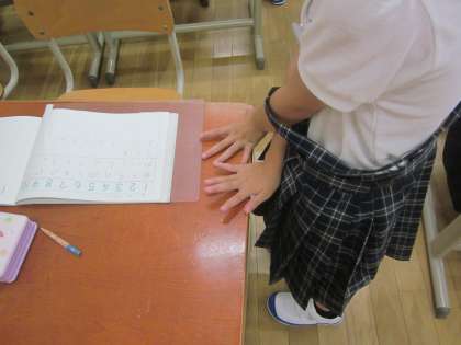写真は机の長さが手のひらやえんぴつがいくつ分になるかを測る活動を行っているところです。