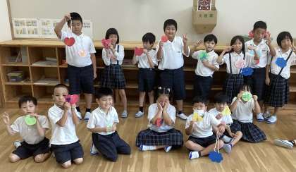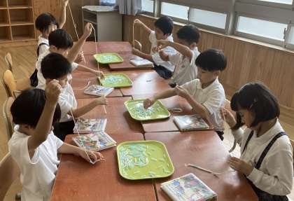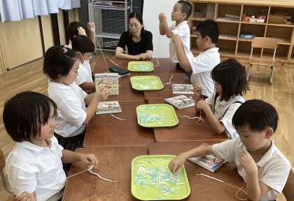 ストローの穴に紐を通したり、かたむすびをしたり…指先をじょうずに使って作ることができました。