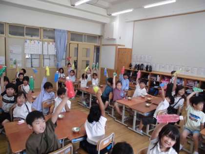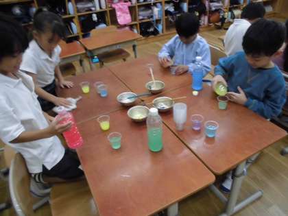 絵の具を水に溶かして色水を作りました。「これはイチゴ味」「リンゴジュースみたい」などいろいろな声が聞こえてきました。たくさん友だちと一緒に楽しんで作ることができました。