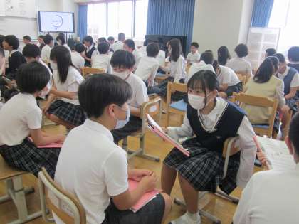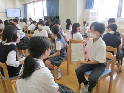 今日の英語は学年で集まり、夏休みの思い出を英語で伝え合いました。絵を見せながら話したり、反応や質問の仕方を考えたりして、伝え方を工夫しながら取り組む姿が素敵でした。