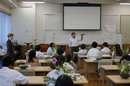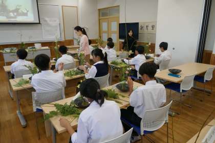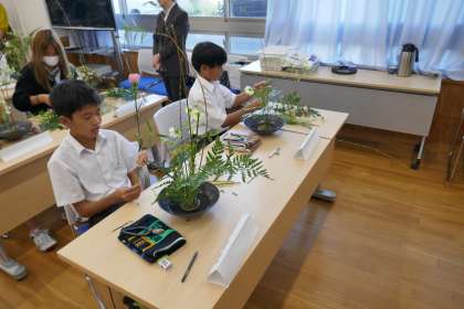 一度完成しても、まだ良くなると感じ、こだわりをもって作品を修正する姿が見えたり、自分なりに作品にタイトルをつけようと悩んでいる姿が見えたり、一生懸命に花と向き合っていました。伝統文化の良さを改めて知りながら、豊かな感性を磨ける良い機会になりましたね。