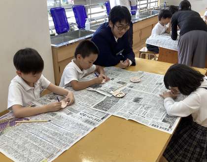 ゲームのあとは豆皿の絵付け体験をしました。職業科の生徒がつくった豆皿に特殊な絵の具を使って絵を描いていきます。職業科の生徒が丁寧に教えてくれました。