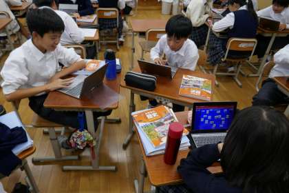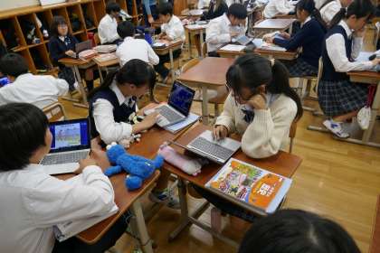 社会では、歴史の授業に入っています。共有ノートを使いながら、写真を年代別に並べ替えている様子です。過去の出来事に目を向けながら、前向きに授業に取り組んでほしいと思います。