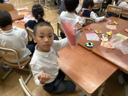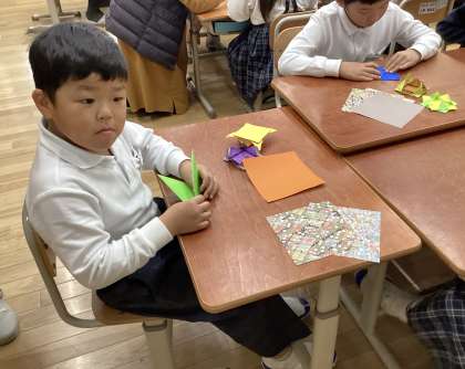 1組 1年生 折り紙のこま作り
