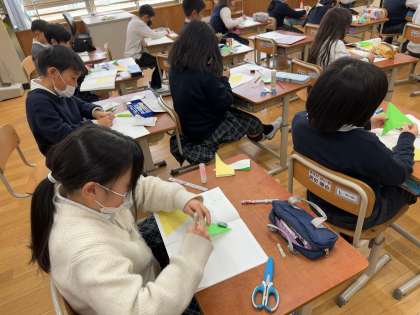 折り紙を切って三角形を作り、角と角を重ねて大きさを比べている真剣な様子が見られました。