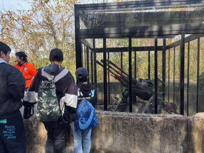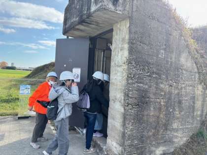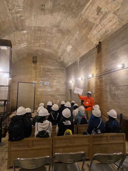 巨大防空壕の中ではプロジェクションマッピングで、特攻隊の方の最後の手紙の朗読が流れます。約80年前の戦争遺跡がそのままに残っていて、生徒たちも驚いたり、ガイドさんの質問に答えたりしていました。ガイドさんから「反応も良くて話もしっかり聞けて、可愛い生徒さんですね」と、褒めていただきました。ガイドの皆さんを幸せにできました。