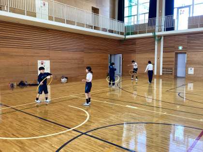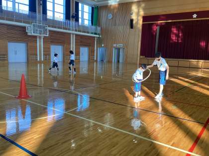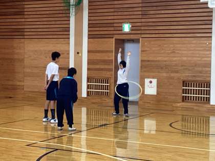 体をどんなふうに動かせばうまくフラフープが回るのかなど、友だちと話し合いながら活動しました。