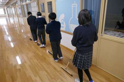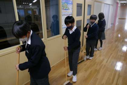 一列になってキレイに掃いてくれています。みんなが使う場所がいつまでも美しく保たれるように、これからも意識して掃除をお願いします。