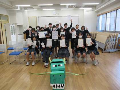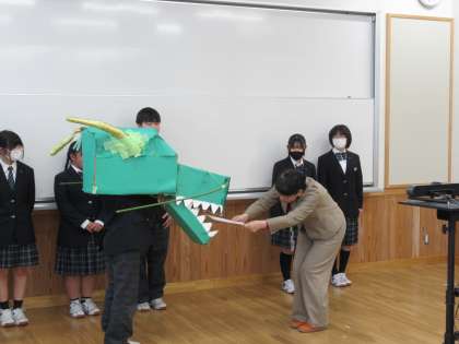 生徒会本部のみなさんも、ありがとうございました。この1年の干支、辰をモチーフにした「のぼるくん」もお役御免です。ありがとう!