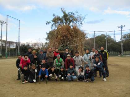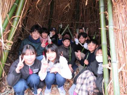 とんどのやぐらが完成しました!日曜日が本番です。完成したとんどの中にも入らせてもらいました。