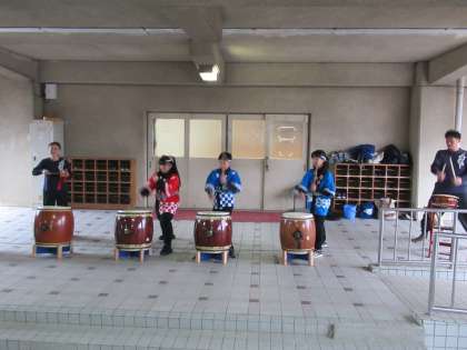 朝から小雨が降っていたので、点火前の和太鼓は体育館前のピロティで演奏を行いました。力強い演奏をたくさんの方に聴いていただきました。