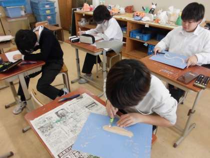 彫刻刀の使い方にも気を付けながら板を彫っています。