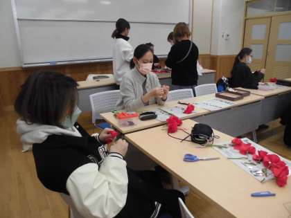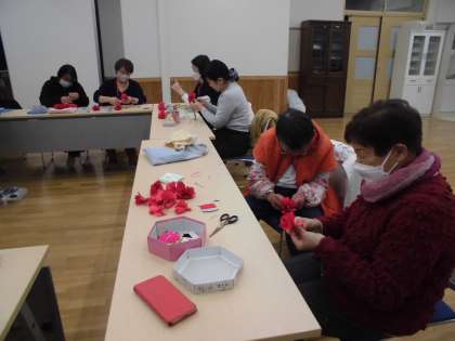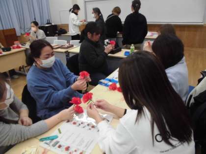 1月10日・17日・24日の3回、9年生の保護者の方々、今までコサージュを作ってくださっていた老人会の方々にご協力をいただき、和気あいあいとした雰囲気の中、楽しく実施することができました。