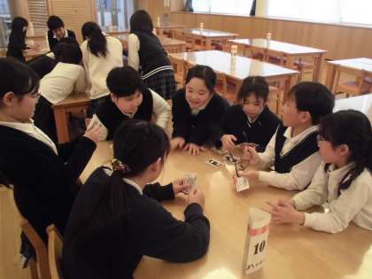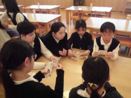 美味しい給食を食べた後にランチルームで食に関する遊びをしている子どもたちがいました。食に興味を持ってほしいです。