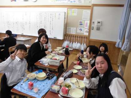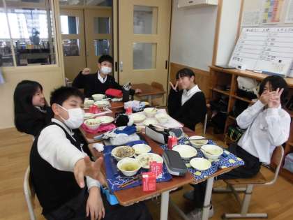 給食時間は、グループで楽しそうに会話しながら食べています。