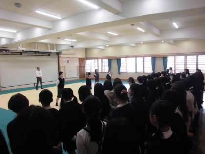 体育館に響き渡るようにお腹の底からいい声を出す練習をしています。