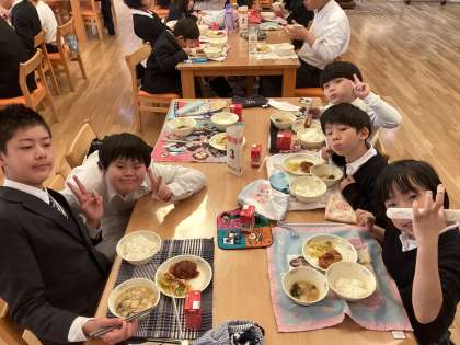 給食調理員さんが心をこめて一つひとつ手作りしてくださった「とんかつ」を1組みんなでいただきました。9年生と食べる最後の給食、とてもおいしかったです。