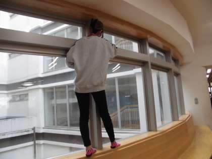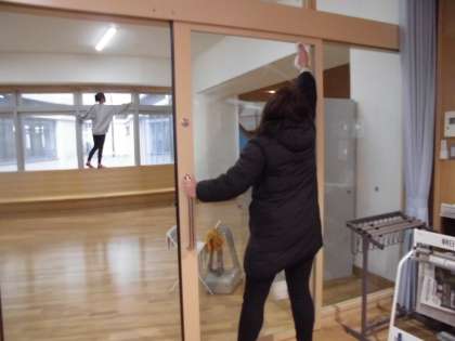 1階から4階にわたって掃除をしていただきました。磨いていただいているのは、図書室の入口扉と図書室前の窓です。