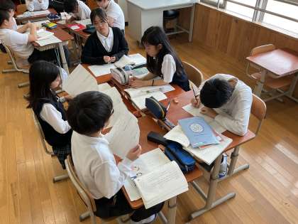 5年生の最初の物語文です。クラス替えで気持ちの沈んだ主人公や周りの友達の様子、関係を図にまとめたり、グループで話し合いながら物語を深く読み込んでいます。